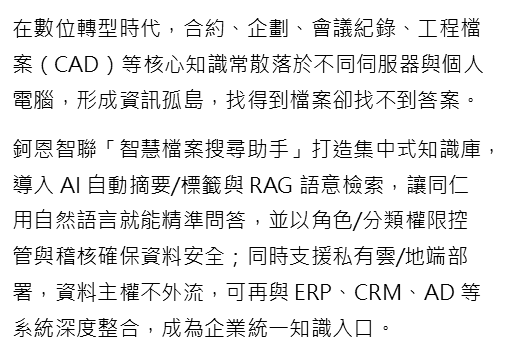把文件、郵件、SOP 沉澱成可詢問的知識庫,回答附來源可追溯;支援權限與版本治理,縮短培訓與回覆時間,降低專家依賴,知識流動更即時可靠。
